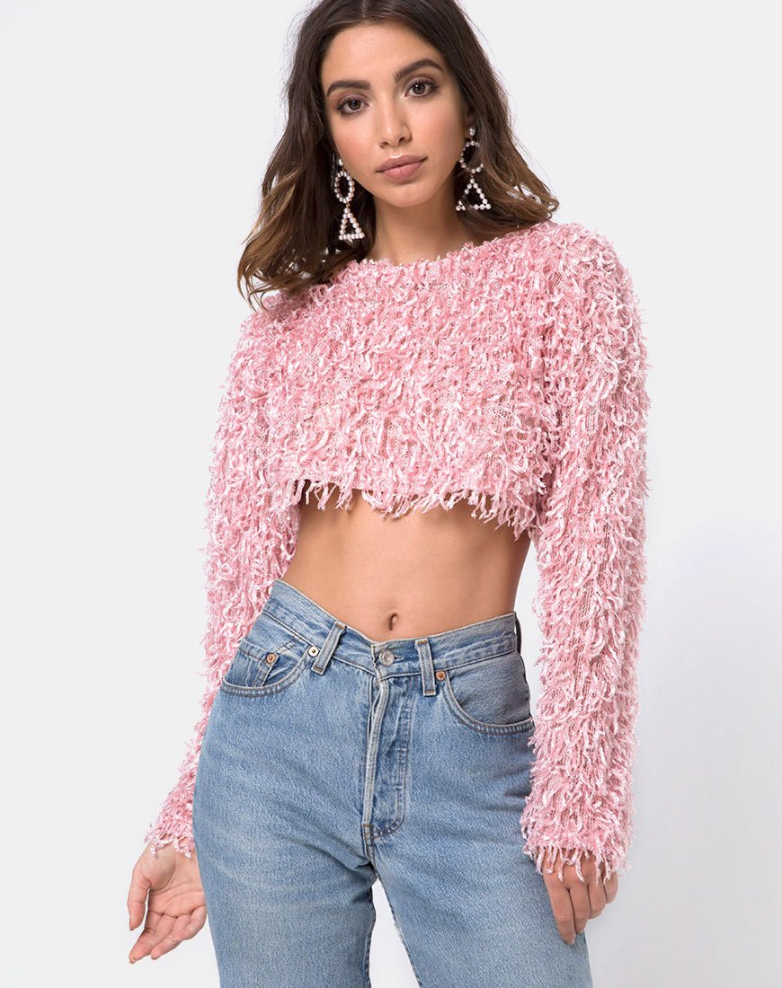 Diabla Crop Jumper in Shaggy Knit Sugar Pink