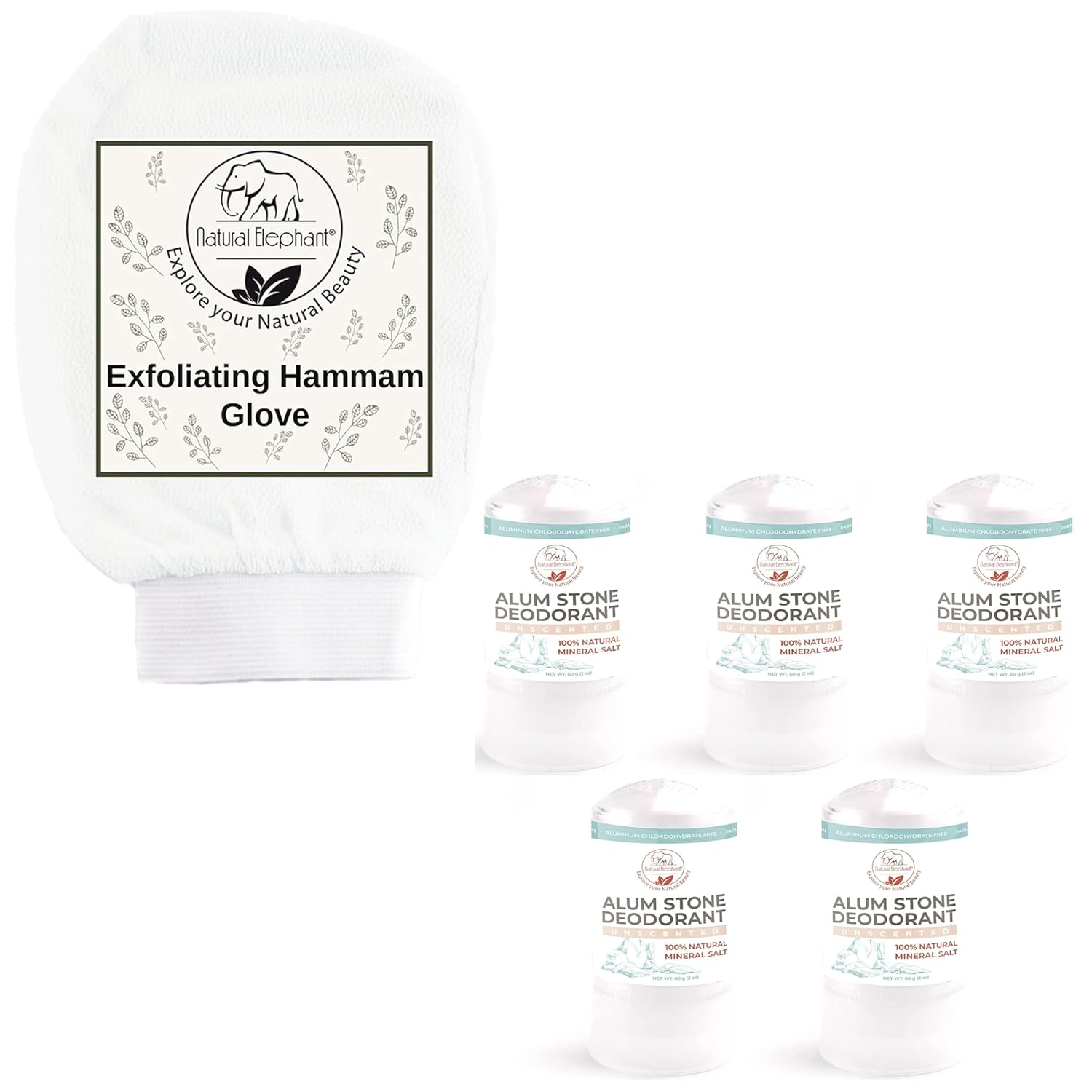 Fresh Skin Duo: Natural Elephant 5 Pack Alum Stone Deodorant Stick & Exfoliating Hammam Glove Pearl White