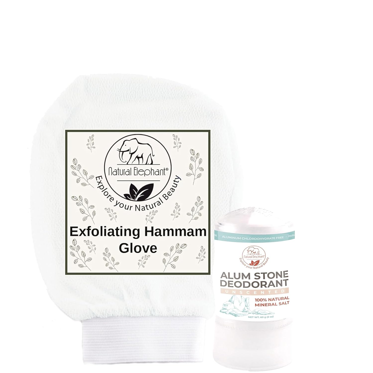 Fresh Skin Duo: Natural Elephant Alum Stone Deodorant Stick & Exfoliating Hammam Glove Pearl White