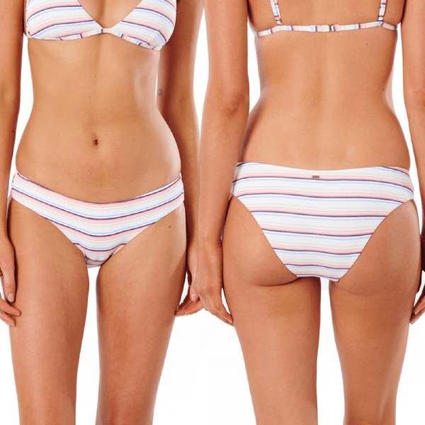 RIP CURL Golden State Cheeky Hipster Bikini Bottom Bask in those 70's vibes with the Golden State Cheeky Hipster Pant. This low rise pant comes fully lined so you can feel confident whilst hitting the surf and sand. Features Printed rib Cheeky coverage Clean edge finish Fully lined Low rise Metal logo trim