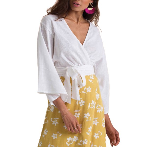 Billabong Got It Right Womens Woven wrap front blouse with plunging neckline and waistband tie. Billabong x Sincerely Jules collection. DETAILS: 100 cotton