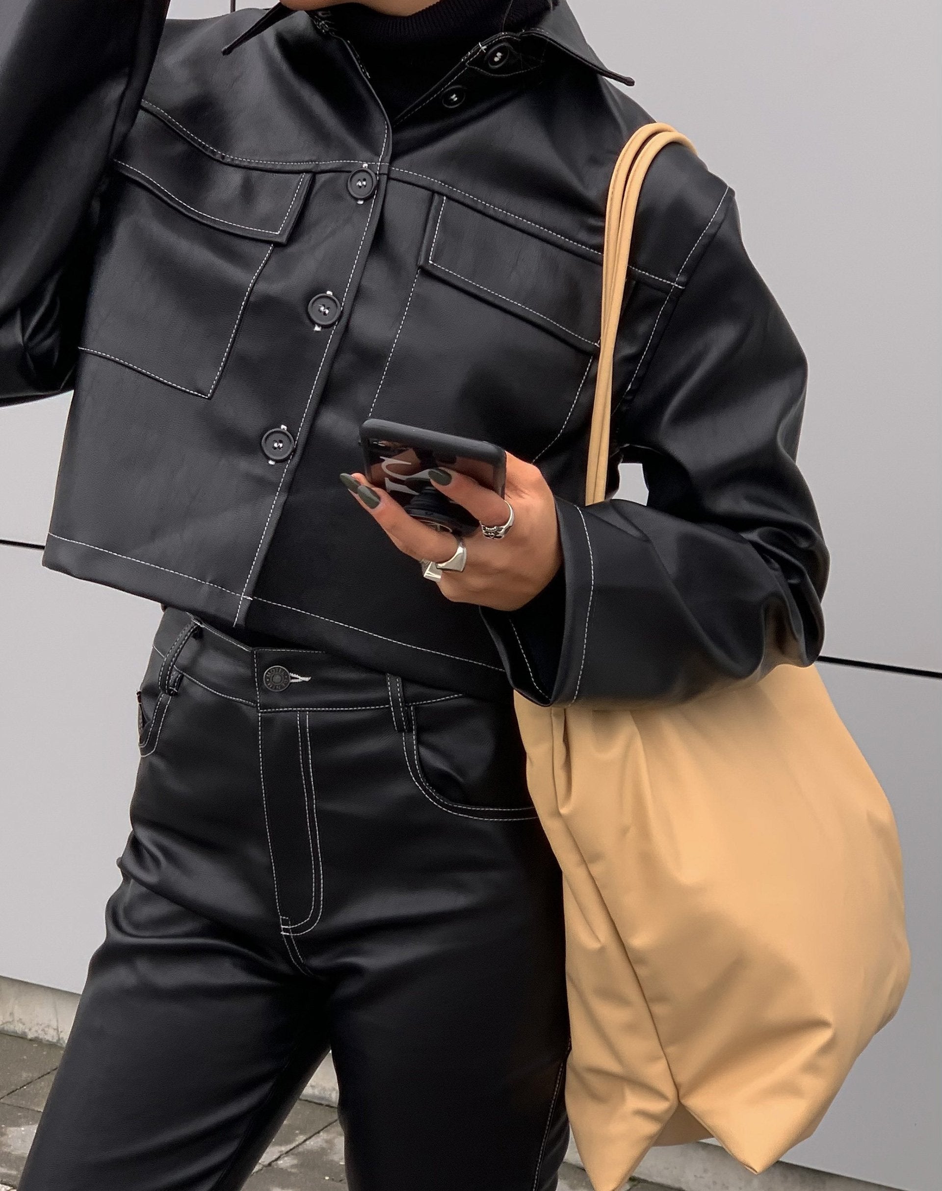 Give your look an instant update with our Jayla shirt. Featuring a cropped fit with long sleeves, collar and pocket detailing in a PU black. Style with a basic white crop and our Parallel jeans in light wash.