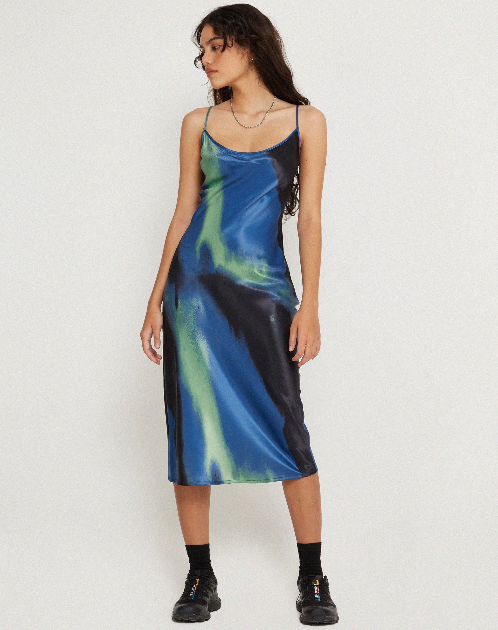 Midi-length dress in a watercolour navy satin fabric, with a scooped neckline, thin straps and a loose fit.