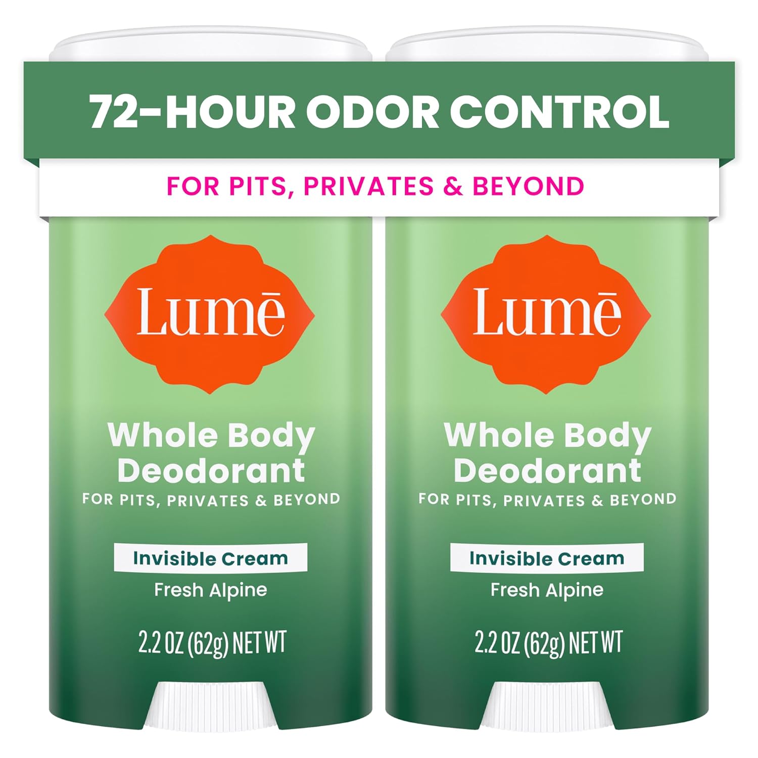 Lume Whole Body Deodorant - Invisible Cream Stick - 72 Hour Odor Control - Aluminum Free, Baking Soda Free, Skin Safe - 2.2 Ounce (Pack of 2) (Fresh Alpine)