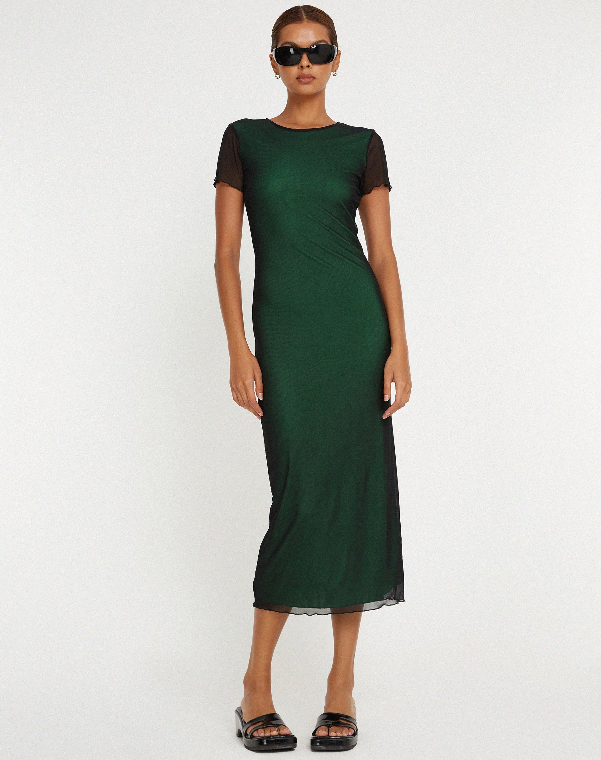 Step out in style with the Roska dress. Featuring a midi, bodycon fit with short sleeves in black with a green underlay.