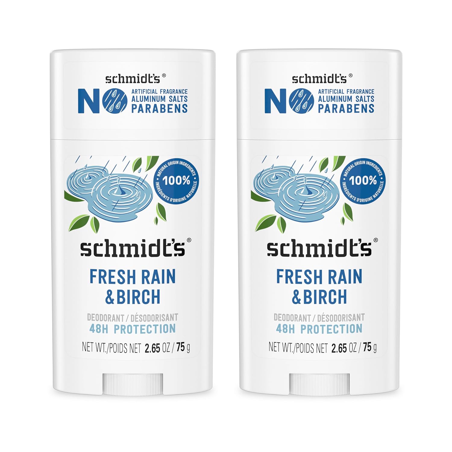 Schmidt's Aluminum-Free Vegan Deodorant Fresh Rain & Birch with 24 Hour Odor Protection, 2 Count for Women and Men, Natural Ingredients, Cruelty-Free, 2.65 oz