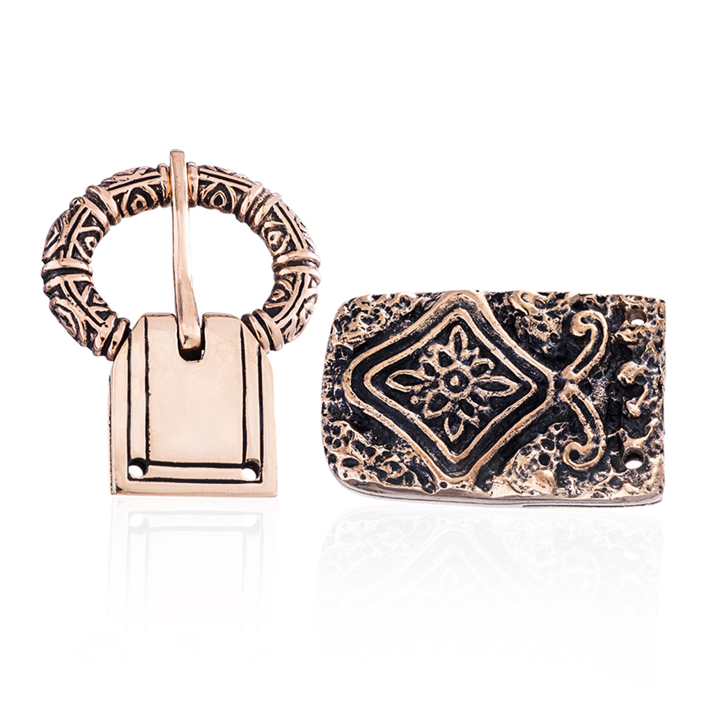 A well made set with a bronze belt buckle and strap end that have are based on the find in grave Bj 750 in Birka Sweden. We have examined the actual finds in person at the Swedish History Museum. They fit a belt that is 20 mm wide and approx. 2.5 - 3 mm thick. The buckle and strap-end are attached with rivets or sewn through the pre-drilled holes. Rivets are not included.