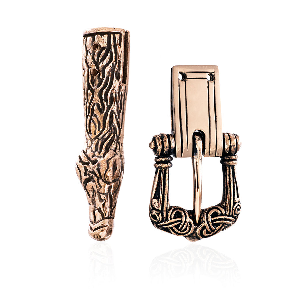 A well made set with a bronze belt buckle and strap end that have are based on the find in grave Bj 949 in Birka Sweden. We have examined the actual finds in person at the Swedish History Museum. They fit a belt that is 14 mm wide and approx. 2.5 - 3 mm thick. The buckle and strap-end are attached with rivets or sewn through the pre-drilled holes. Rivets are not included.