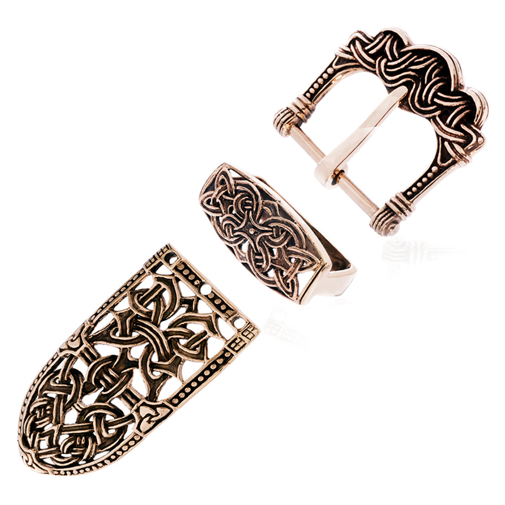 Premium belt fitting set in bronze that is based on the find in the Gokstad ship burial in Norway (9th Century). They fit a belt that is approx. 2.5 - 3 mm thick and 35 mm wide, which is quite wide and prominent considering most other Viking Age belts. The parts are attached with rivets or sewn through the pre-drilled holes. Rivets are not included. (Picture of fitting for reference - leather strap not included).